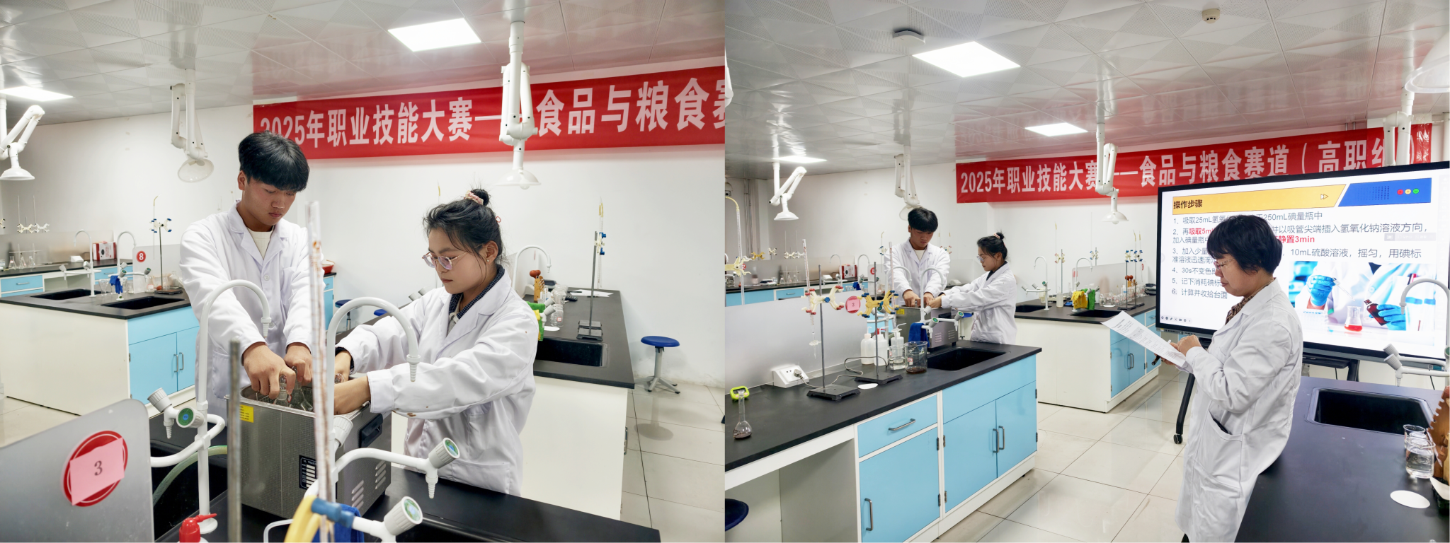 食品与粮食赛道聚焦食品质量检测与粮食安全核心问题。旨在通过竞赛检验员工对食品安全知识的了解程度、考查员工专业技能的掌握程度,并通过实践将《食品安全法》等标准法规融入教学,强化安全生产意识,实现“以赛促教、以赛促学”的教学理念。本赛项设置在规定时间内完成技能操作及现场讲解,不仅展示专业技能的熟练度与规范性,更考验解决技术难题的能力。比赛中,选手们准备充分、操作规范、思路清晰,完整的演示了竞赛内容。本次竞赛还邀请了校外行业专家与资深教师担任评委,进行全面打分与点评,为后续参加更高级别竞赛奠定了坚实基础。